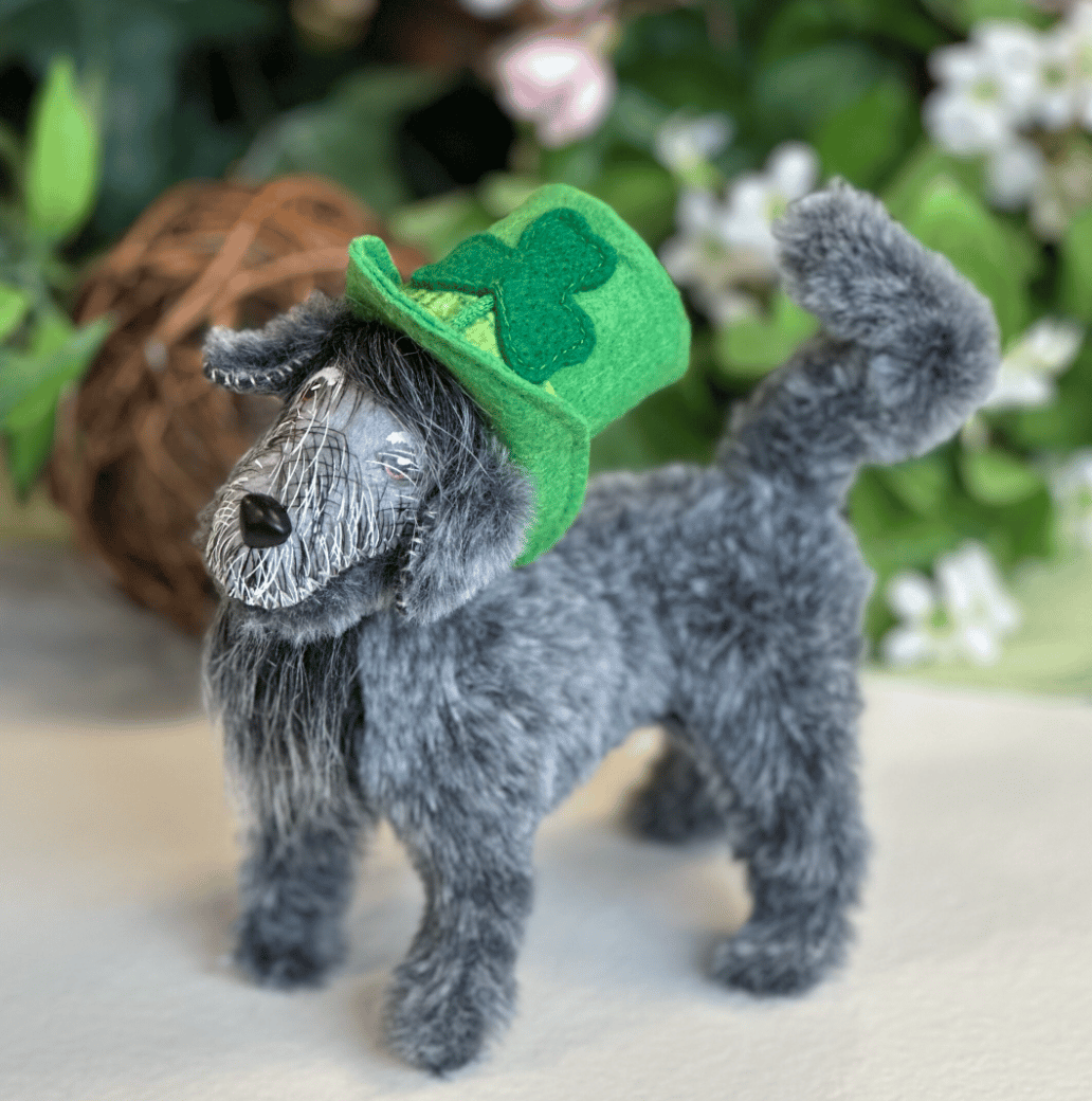 The first-ever Irish Wolfhound design has new artwork depicting the breed’s hairy face. It has a gray fuzzy body and wears a green top hat with shamrock detail.