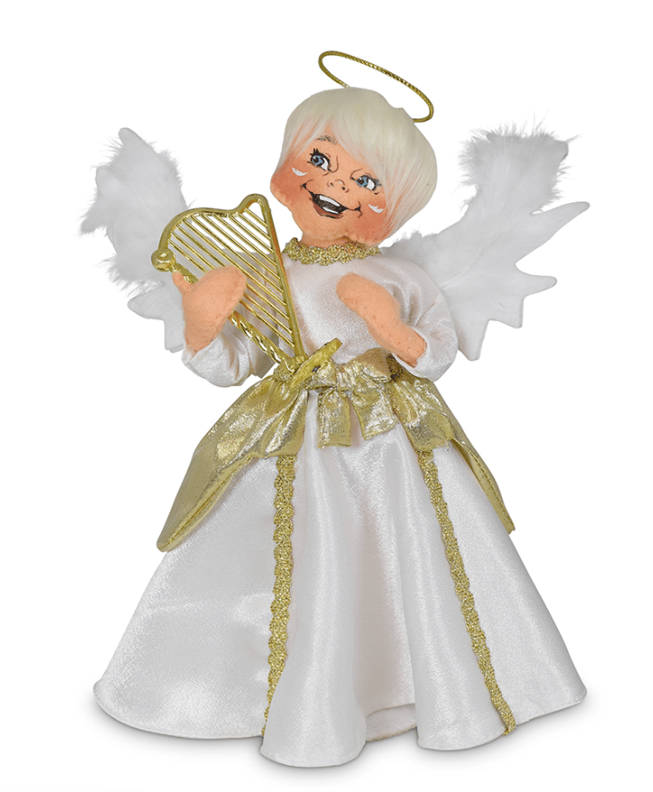 This 9 inch angel design is absolutely exquisite in her long white satin dress with gold trim details. She has white felt wings and a gold halo. She’s holding a harp.